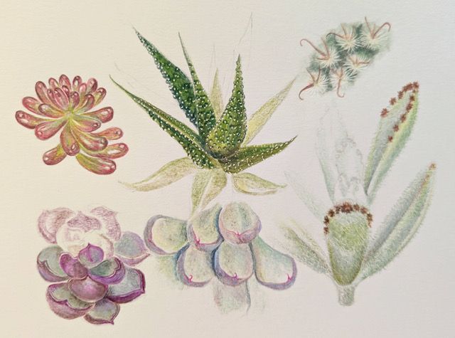 On this day course you will work from life studying a variety of different cacti and succulents to realistically illustrate their textures and colour using coloured pencils and graphite. The textures will include spikes and hairs on cacti as well as shine and bloom on succulents. You will learn how to colour match, blend and layer colours, create highlights and emboss paper to show intricate details. All materials will be provided, ( some with a small charge) but you are welcome to bring your own materials if you have them. The outcome of the workshop will be a study sheet of cacti and succulents.